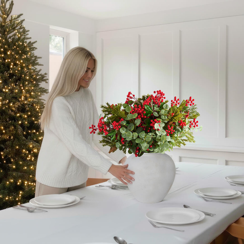 Our Pine Cone, Eucalyptus & Berry arrangement perfectly blends natural charm with modern elegance. The rich green tones of eucalyptus pair beautifully with earthy pine cones and vibrant berries, creating a festive arrangement that brings warmth to any space.